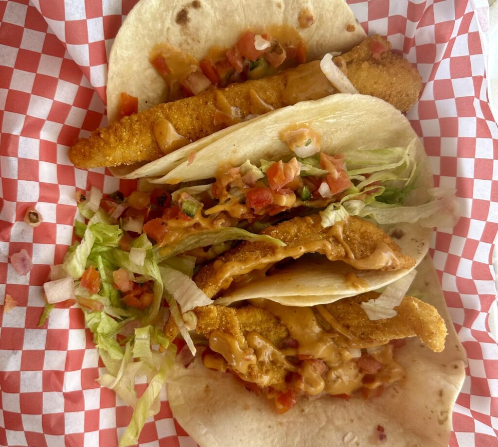 Best fish tacos I've had at the lake yet! A little bit of fresh Pico and cilantro, fish was battered, but light, and that secret sauce! YUM!!!